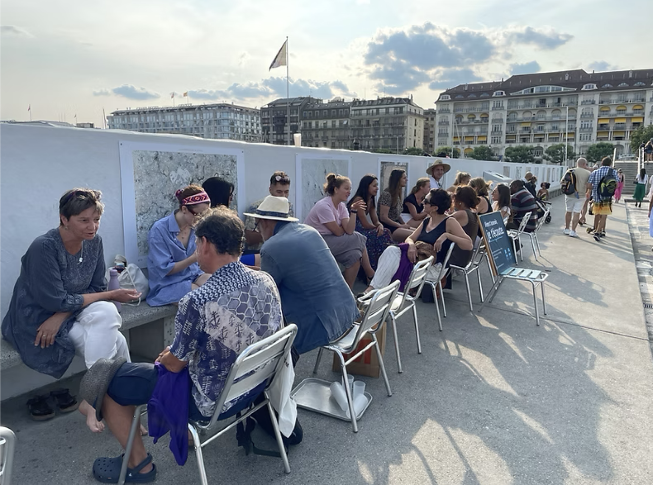 Mais nous avons une p’tite solution… Des bénévoles s’installent sur une chaise dans la rue, au sein de l’espace public. Face à chaque bénévole, une chaise vide et une invitation aux passants-es :